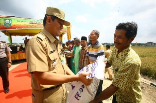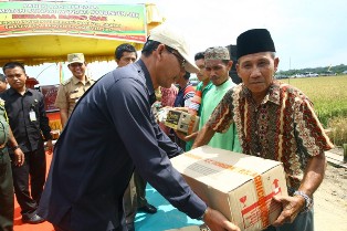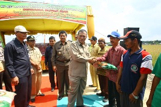 Kepala BPPT Prov.Riau menyerahkan secara simbolis sekotak racun hama kepada petani di acara panen padi perdana desa Muara Kelantan Kec.Sungai Mandau.