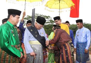 Ketua LAMR Rohul, Tengku Rafli, memasangkan Kain Selempang kepada Tennas Efendi setibanya di lokasi kegiatan pembukaan Muskerda.